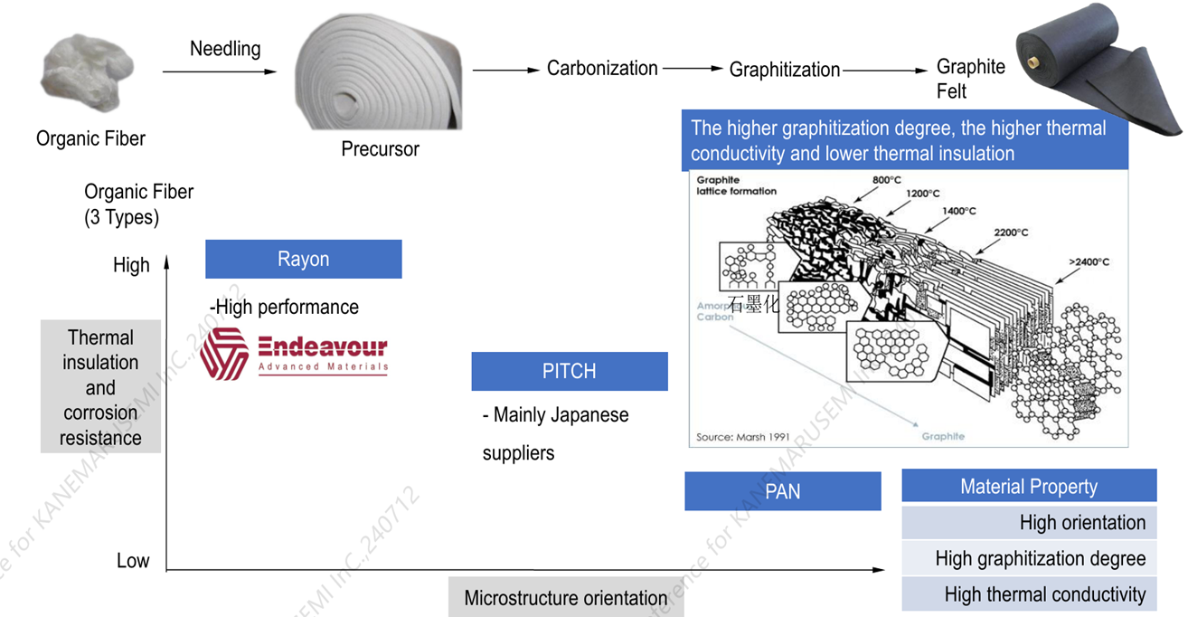 Carbon based insulation is made from organic fiber precursor through needling process, carbonized and graphitized (sometimes purified). It is to be used in vacuum or international gas protected environment.